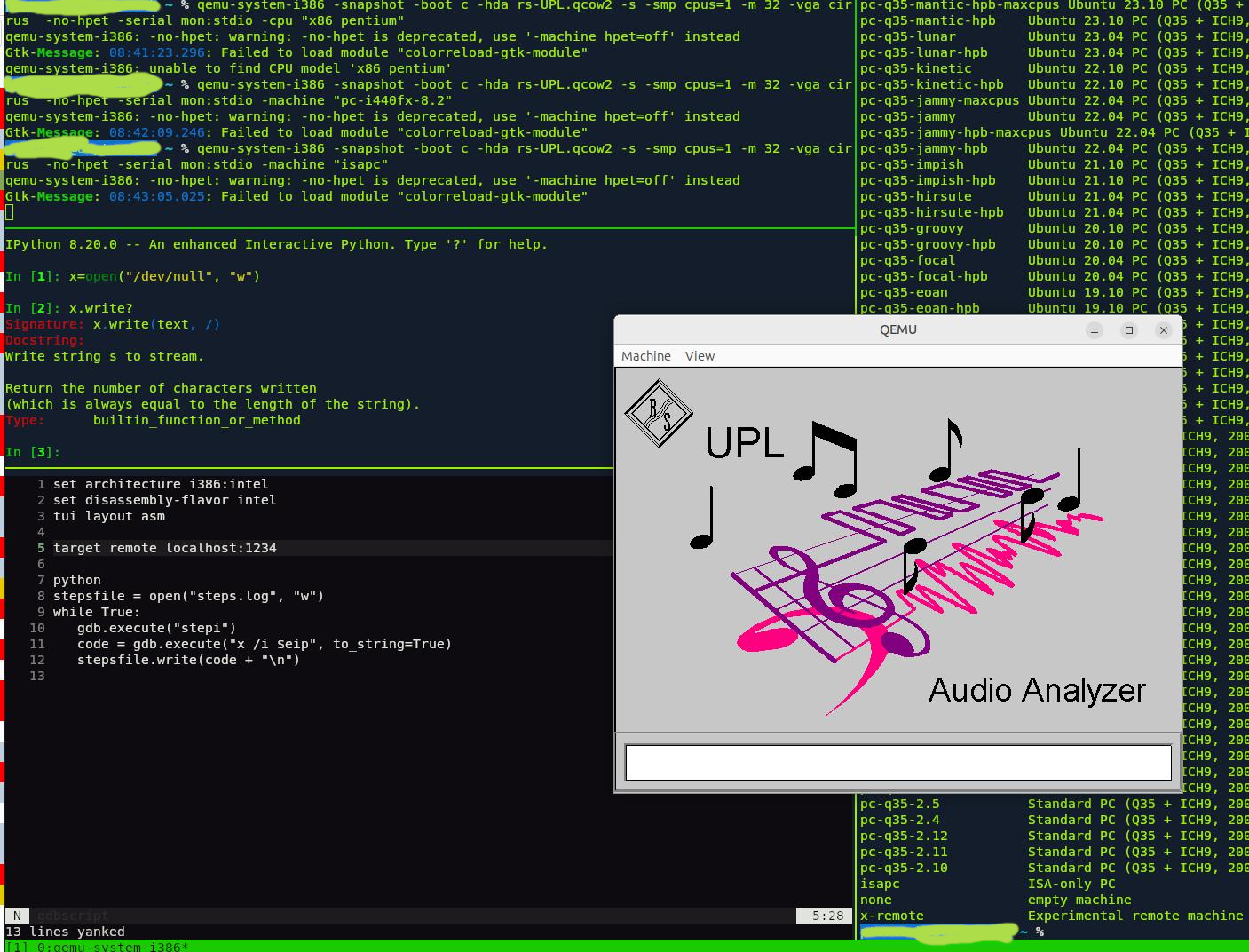 To become independent of page mappings, etc., a complete state of the register set and instructions was written for every CPU instruction. The resulting 2GB text file was analyzed using AWK. Only the recognition routines for the entire UPL hardware were discovered this way. Unfortunately, even the SERPA initialization could not be found.