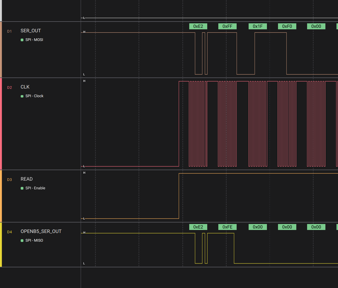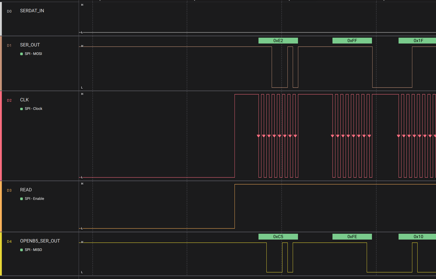 The next attempt, slightly delaying the CLK signal relative to the READ signal, did produce a correct board ID in the first burst. However, the UPL still failed to recognize it.